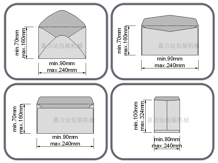加工信封規格 | 中式(1-9)號: 162×102-229×324毫米 西式(2-7)號: 162×114-160×230毫米 |