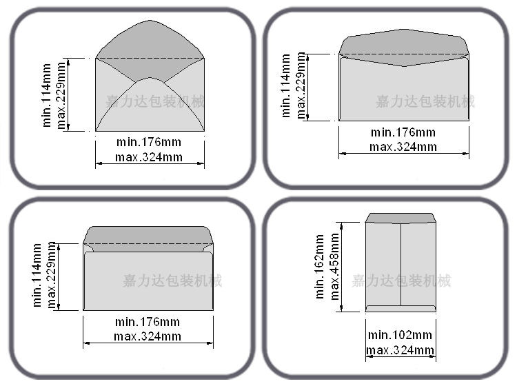 The machine is specially designed for pocket and wallet envelopes including No.1-10 pocket envelopes and No.2-9 wallet ones, as well as other irregular paper bags within this range。